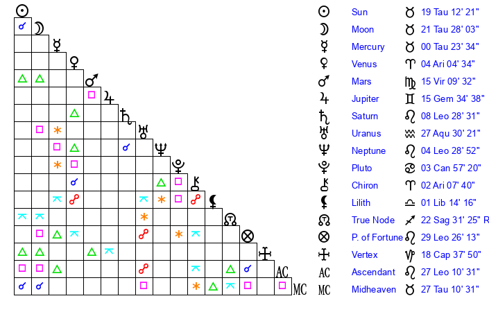 | Sun | 19 Taurus 12 | 20 Taurus 17 | 1 Virgo 39 |