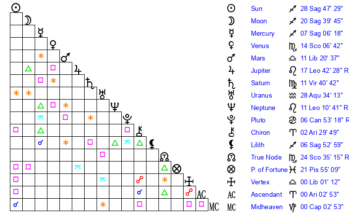| Mercury | 18 Sagittarius 34 | 29 Sagittarius 44 | 11 Aries 4 |