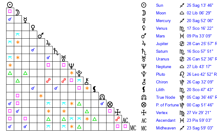 | Sun | 25 Sagittarius 14 | 26 Sagittarius 0 | 7 Pisces 19 |