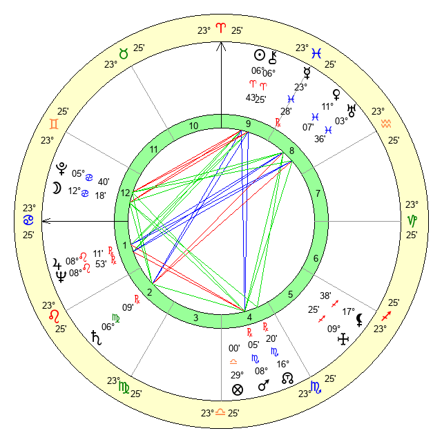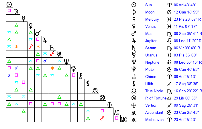 | Moon | 12 Cancer 25 | 12 Pisces 58 | 6 Taurus 57 |