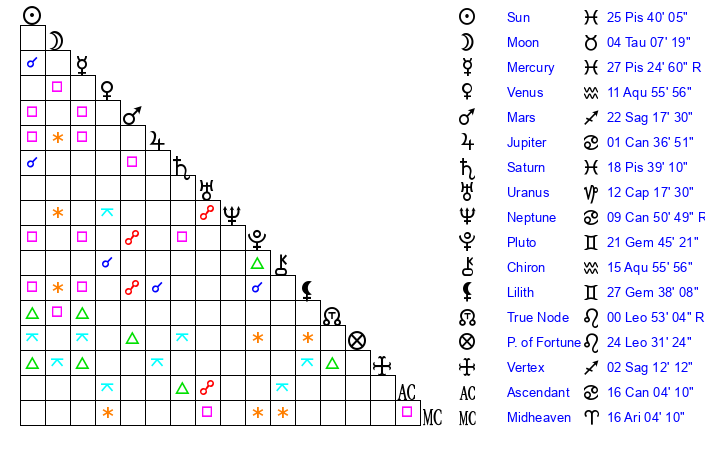 | Sun | 25 Pisces 40 | 27 Pisces 4 | 19 Cancer 51 |
