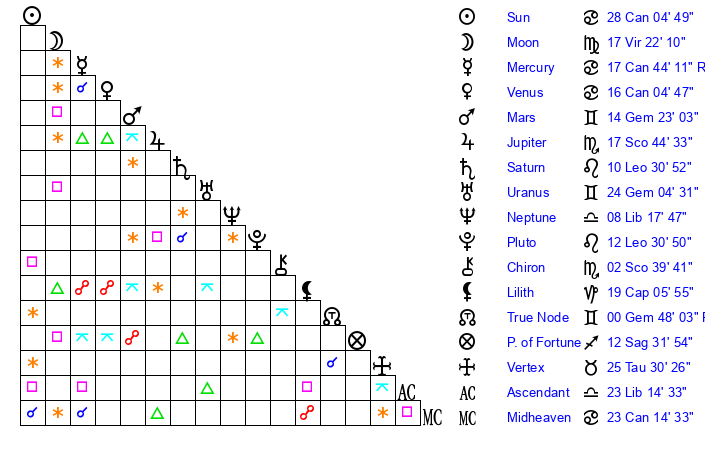 | Moon | 17 Virgo 27 | 18 Gemini 17 | 17 Cancer 1 |
