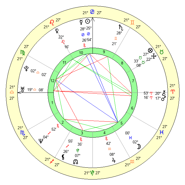 | Sun | 25 Cancer 54 | 26 Cancer 19 | 15 Virgo 53 |