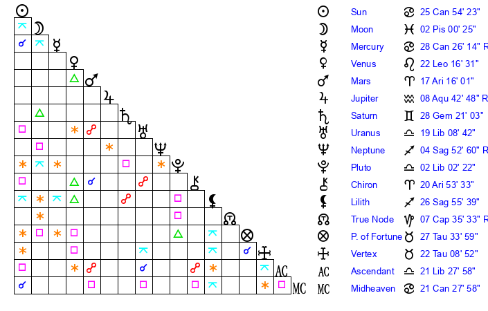 | Sun | 25 Cancer 54 | 26 Cancer 19 | 15 Virgo 53 |