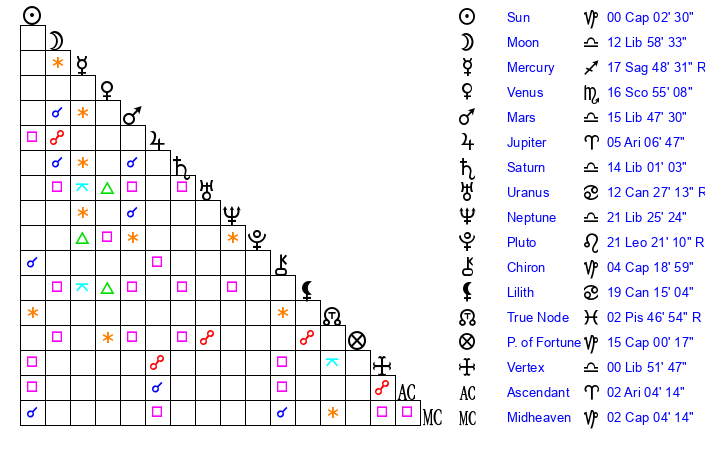 | Sun | 0 Capricorn 2 | 1 Capricorn 21 | 14 Pisces 4 |