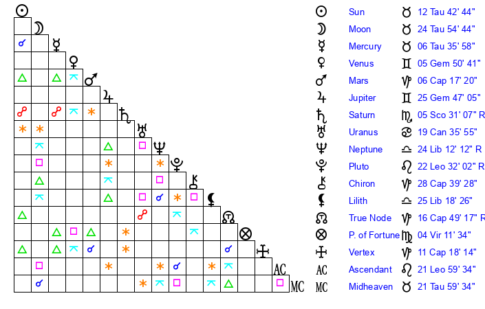 | Moon | 24 Taurus 54 | 3 Leo 9 | 23 Sagittarius 26 |