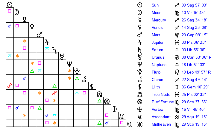 | Neptune | 18 Libra 51 | 29 Pisces 22 | 19 Libra 21 |