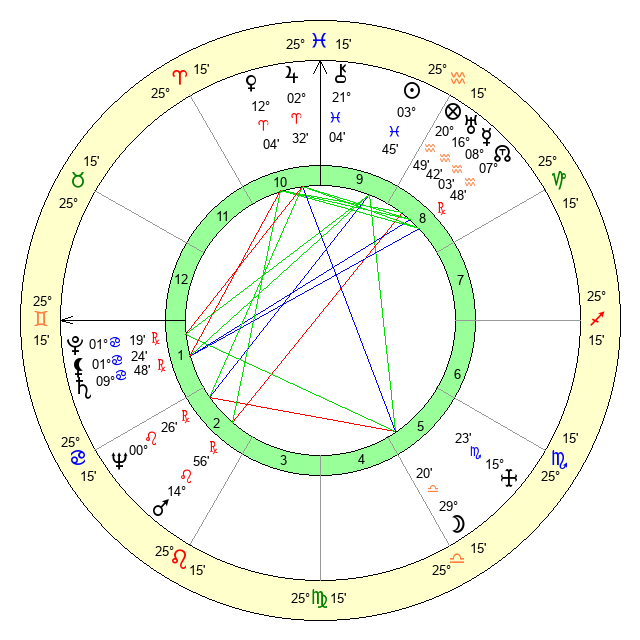 | Sun | 3 Pisces 46 | 5 Pisces 20 | 20 Gemini 23 |
