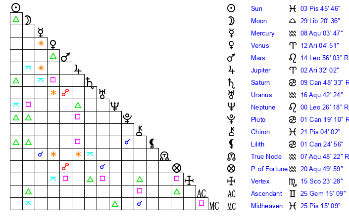 | Sun | 3 Pisces 46 | 5 Pisces 20 | 20 Gemini 23 |