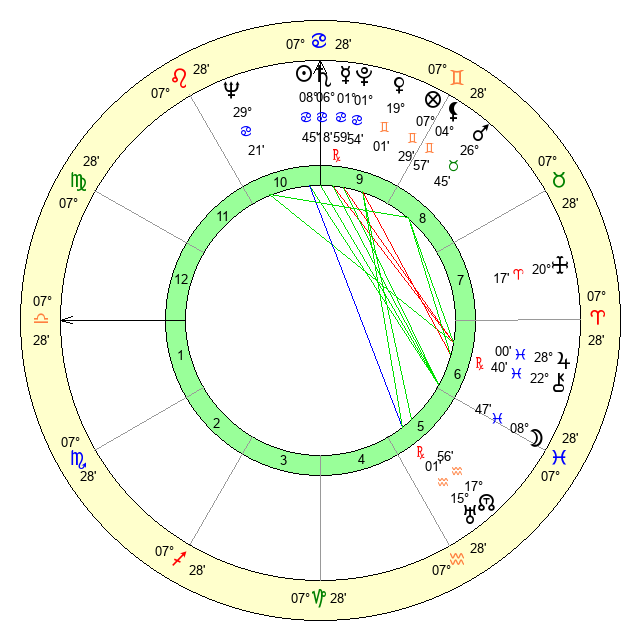 | Sun | 8 Cancer 45 | 10 Cancer 6 | 25 Libra 13 |