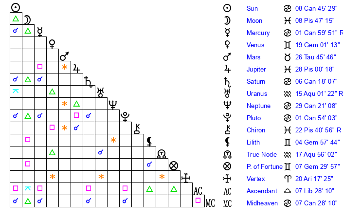 | Neptune | 29 Cancer 22 | 2 Aries 10 | 2 Leo 36 |