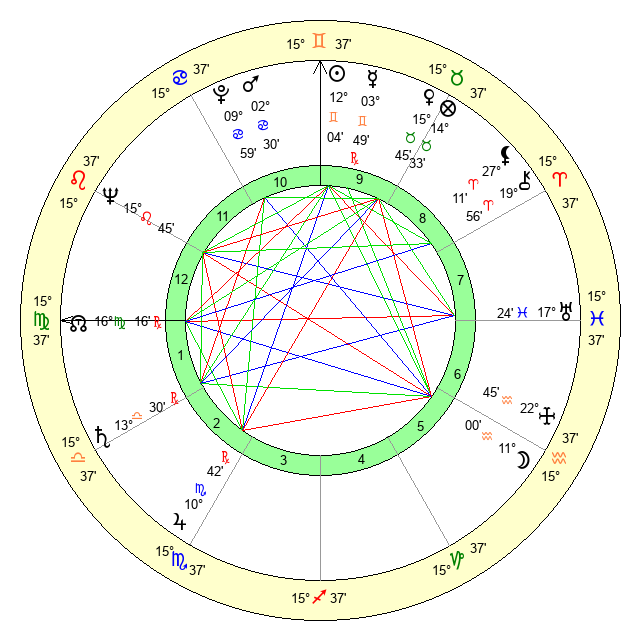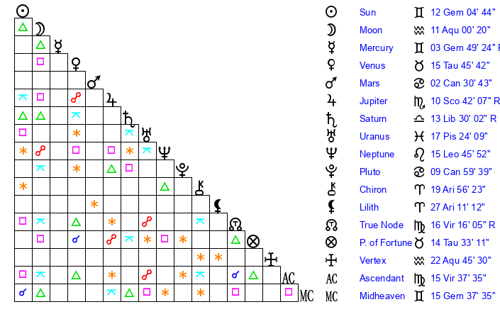 | Sun | 12 Gemini 5 | 13 Gemini 22 | 19 Virgo 52 |