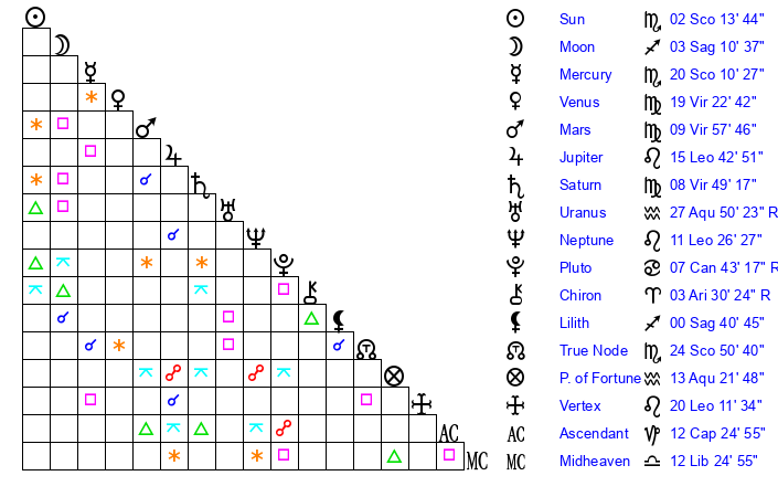 | Sun | 2 Scorpio 13 | 3 Scorpio 32 | 19 Aquarius 40 |