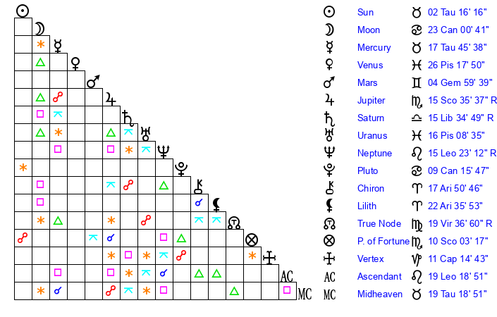 | Uranus | 16 Pisces 8 | 25 Taurus 55 | 16 Pisces 54 |