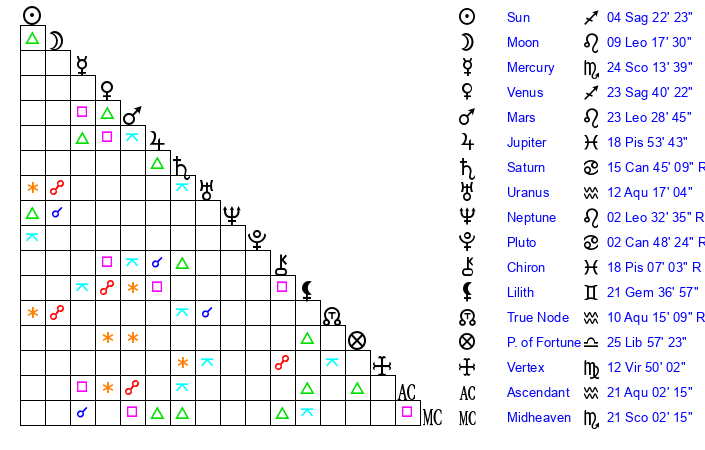 | Moon | 9 Leo 16 | 28 Aquarius 44 | 19 Leo 57 |