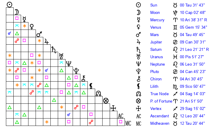 | Neptune | 6 Leo 31 | 0 Aries 47 | 9 Leo 10 |