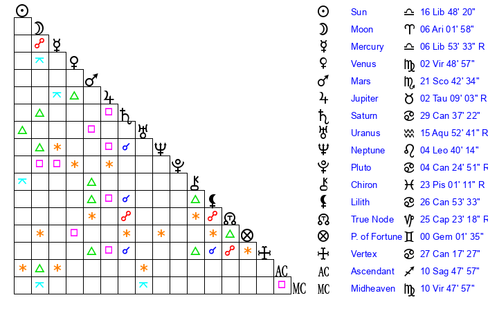 | Sun | 16 Libra 48 | 17 Libra 24 | 6 Aquarius 58 |
