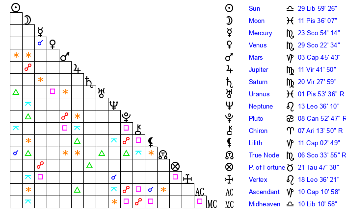 | Moon | 11 Pisces 36 | 24 Scorpio 27 | 21 Capricorn 1 |