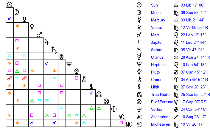 | Saturn | 6 Virgo 22 | 27 Pisces 54 | 12 Virgo 5 |