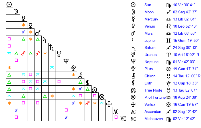 Sun | 16 Virgo 30 | 17 Virgo 16 | 22 Sagittarius 15 |