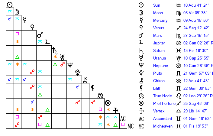 | Sun | 10 Aquarius 42 | 12 Aquarius 4 | 7 Gemini 9 |