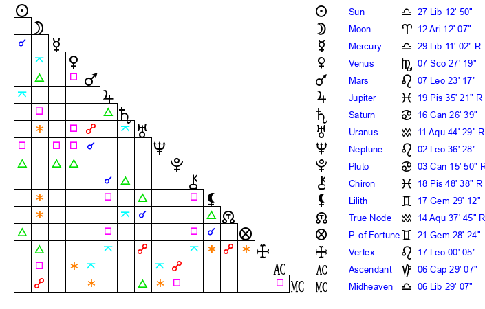 | Moon | 12 Aries 6 | 0 Scorpio 35 | 23 Aries 14 |