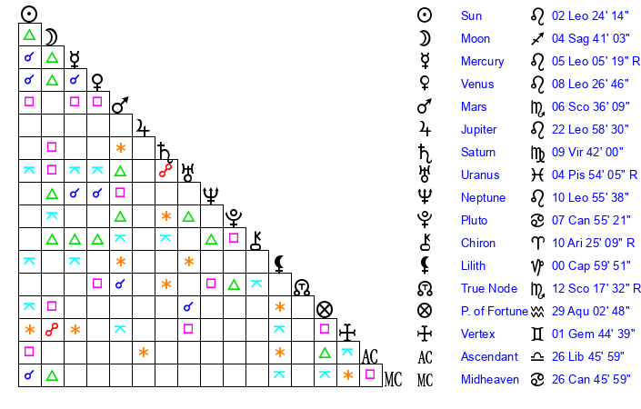 | Moon | 4 Sagittarius 45 | 14 Leo 26 | 10 Libra 5 |