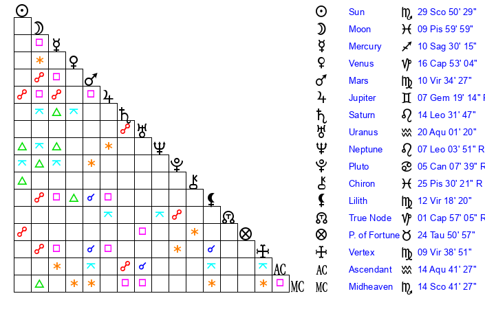| Sun | 29 Scorpio 50 | 0 Sagittarius 39 | 19 Pisces 19 |