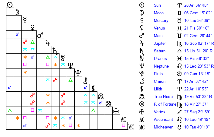 | Sun | 28 Aries 36 | 29 Aries 53 | 6 Leo 29 |