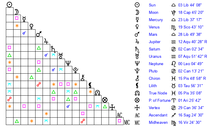 | Mercury | 23 Libra 37 | 15 Libra 53 | 2 Aquarius 35 |