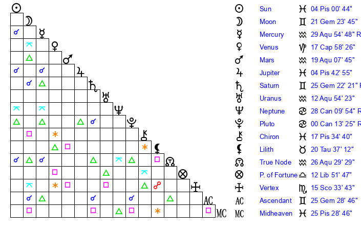 | Sun | 4 Pisces 0 | 5 Pisces 20 | 21 Gemini 35 |
