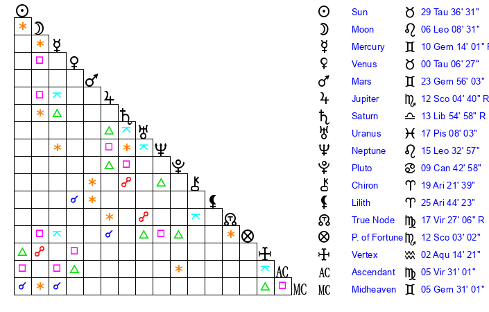 | Moon | 6 Leo 11 | 16 Pisces 12 | 6 Taurus 19 |