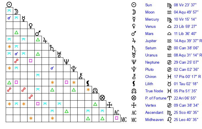 | Moon | 4 Aquarius 44 | 25 Sagittarius 29 | 28 Aquarius 42 |