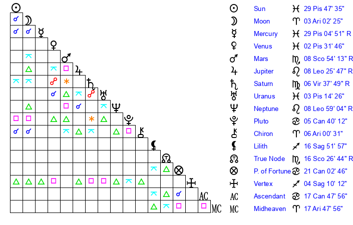 | Moon | 3 Aries 2 | 10 Sagittarius 10 | 7 Aquarius 19 |