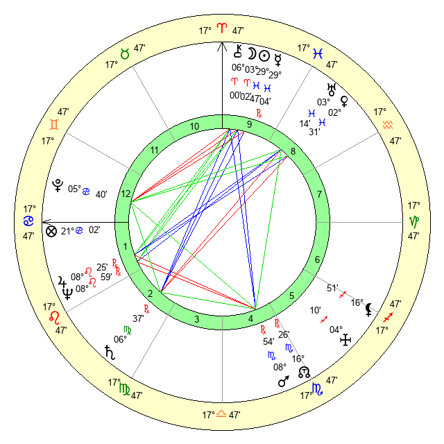 | Sun | 29 Pisces 47 | 0 Aries 20 | 11 Cancer 25 |