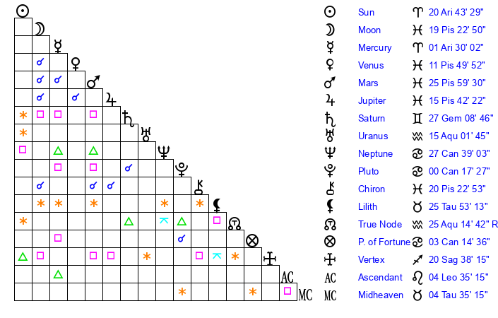 | Moon | 19 Pisces 14 | 7 Libra 43 | 0 Aries 0 |