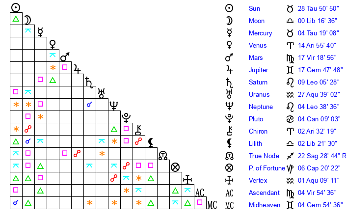 | Sun | 28 Taurus 51 | 29 Taurus 56 | 11 Virgo 19 |