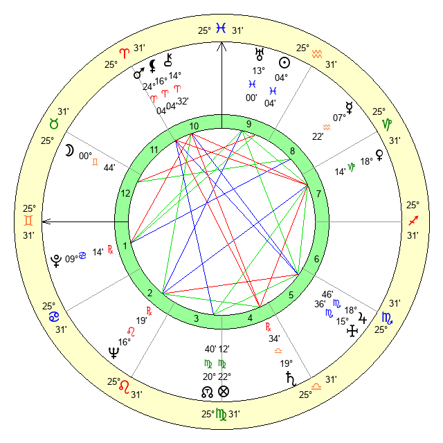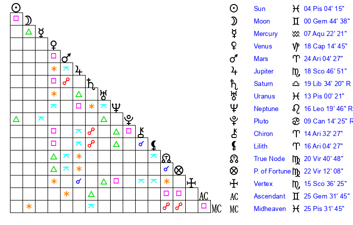 | Sun | 4 Pisces 4 | 5 Pisces 20 | 13 Gemini 59 |