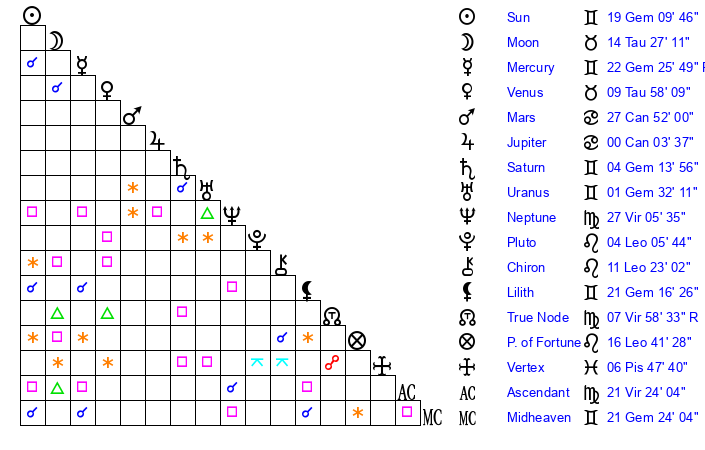 | Moon | 14 Taurus 20 | 13 Sagittarius 11 | 28 Taurus 16 |