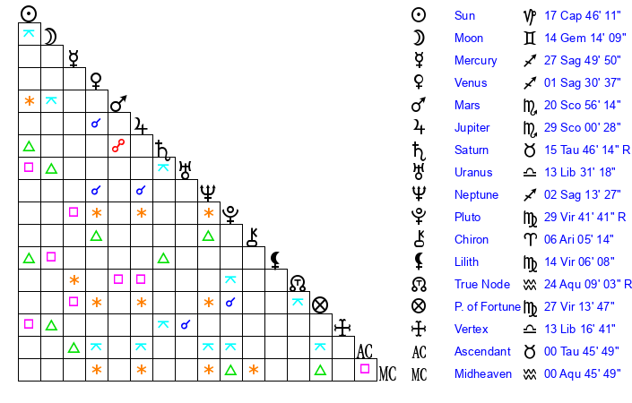 | Moon | 14 Gemini 13 | 11 Taurus 11 | 7 Gemini 54 |