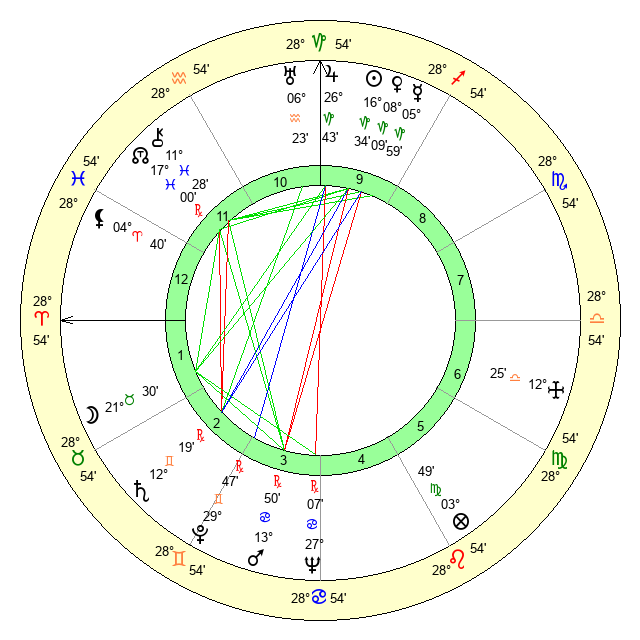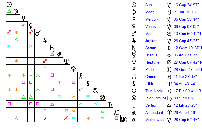 | Moon | 21 Taurus 26 | 13 Virgo 17 | 25 Gemini 57 |