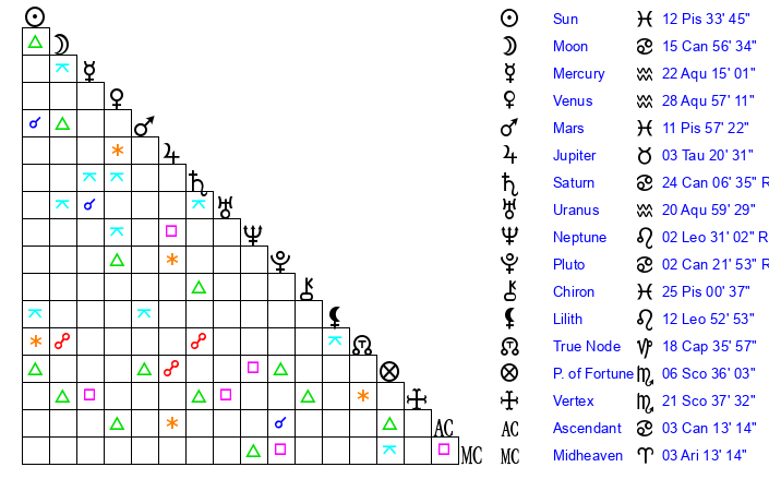 | Sun | 12 Pisces 33 | 13 Pisces 22 | 27 Gemini 48 |
