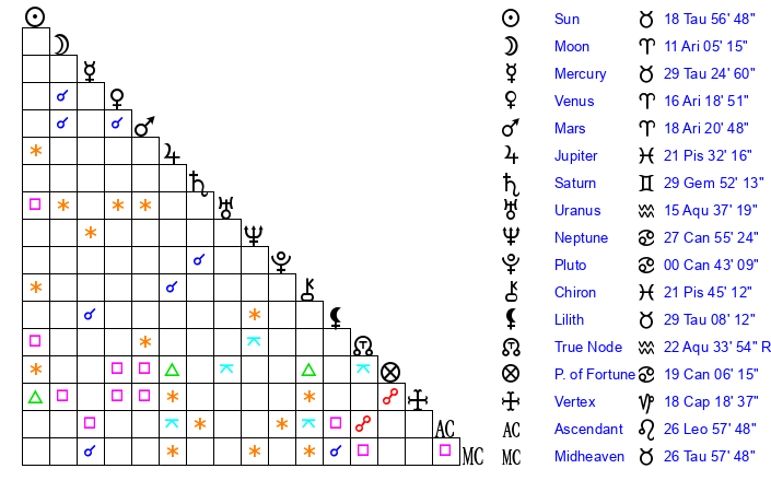 | Sun | 18 Taurus 56 | 20 Taurus 17 | 4 Virgo 17 |