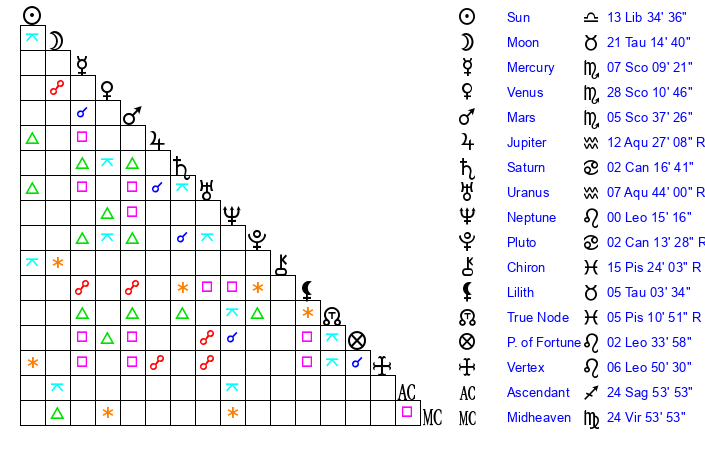 | Sun | 13 Libra 34 | 14 Libra 41 | 5 Aquarius 40 |