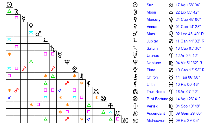 | Moon | 22 Libra 45 | 19 Gemini 48 | 25 Pisces 31 |