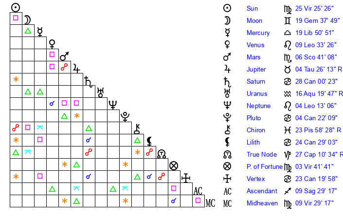 | Moon | 19 Gemini 47 | 19 Leo 25 | 16 Gemini 1 |