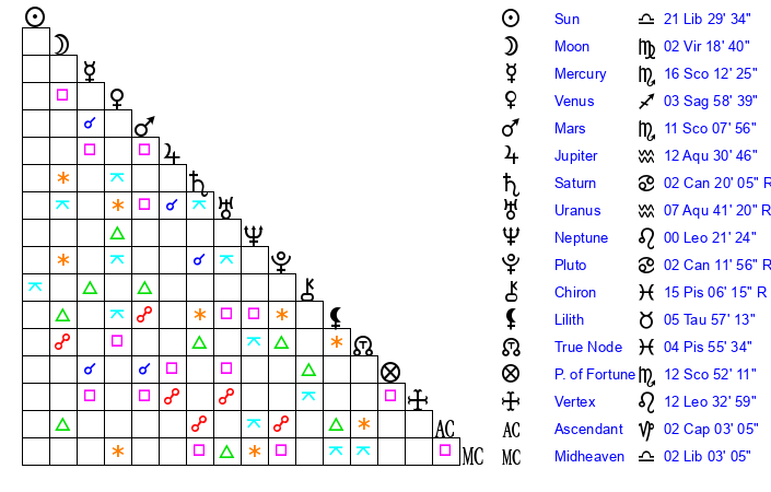 | Sun | 21 Libra 29 | 22 Libra 35 | 13 Aquarius 48 |