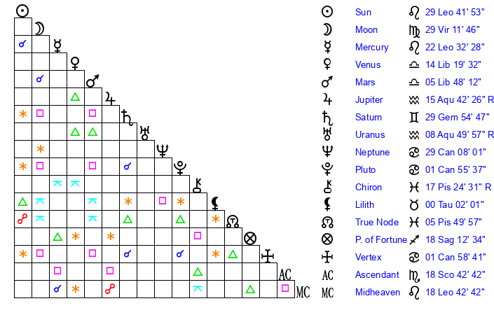 | Sun | 29 Leo 41 | 0 Virgo 49 | 19 Sagittarius 51 |