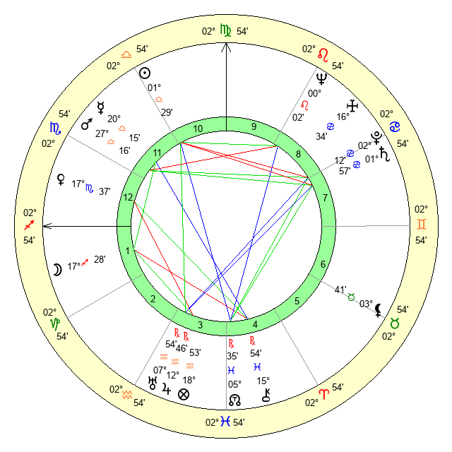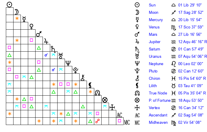 | Moon | 17 Sagittarius 27 | 12 Scorpio 26 | 7 Capricorn 22 |