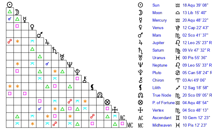 | Sun | 18 Aquarius 39 | 20 Aquarius 11 | 2 Gemini 13 |